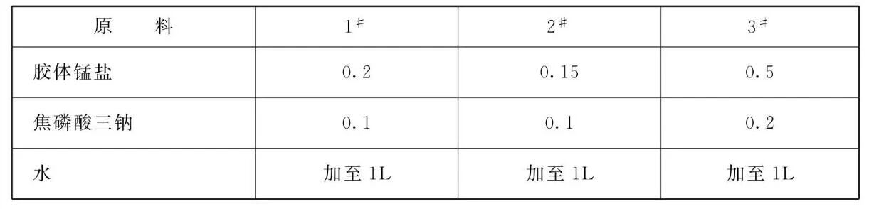 本品各组分质量份配比范围为:胶体锰盐0.15~0.5、焦磷酸三钠0.1~0.2、水加至1L。