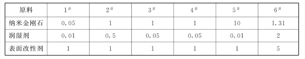 本品各组分质量份配比范围为:纳米金刚石0.05~10、润湿剂0.01 ~2、表面改性剂1~5、分散剂0.1 ~ 10、化学添加剂0.2 ~ 1、水88.69 ~ 98.64。