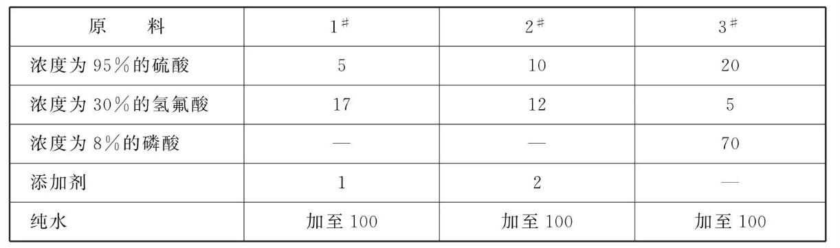 本品各组分质量份配比范围为:浓度为95%的硫酸5~20、浓度为30%的氢氟酸5~17、浓度为8%的磷酸60~80、添加剂1 ~5、纯水加至100。
