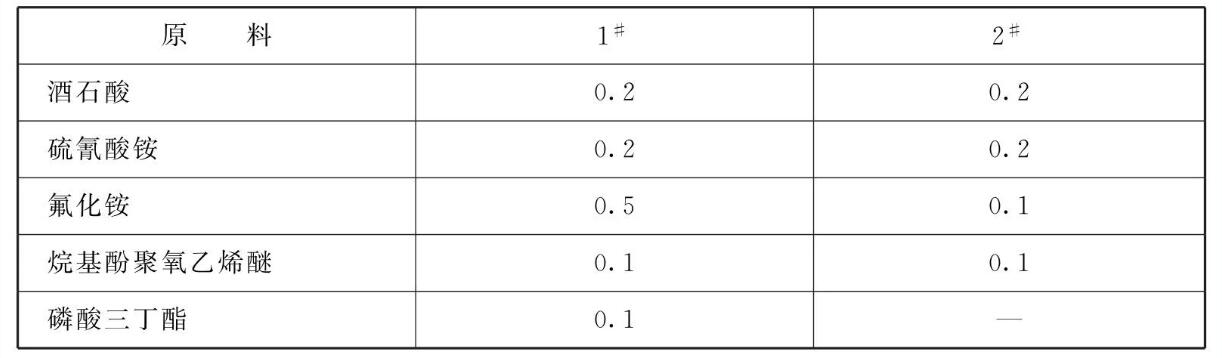 所述添加剂由以下组分组成:酒石酸0.2 ~0.5、硫氰酸铵0.2 ~ 0.5、氟化铵0.2~0.5、烷基酚聚氧乙烯醚0.1~0.2、 磷酸三J酯0.01 ~0.05。
