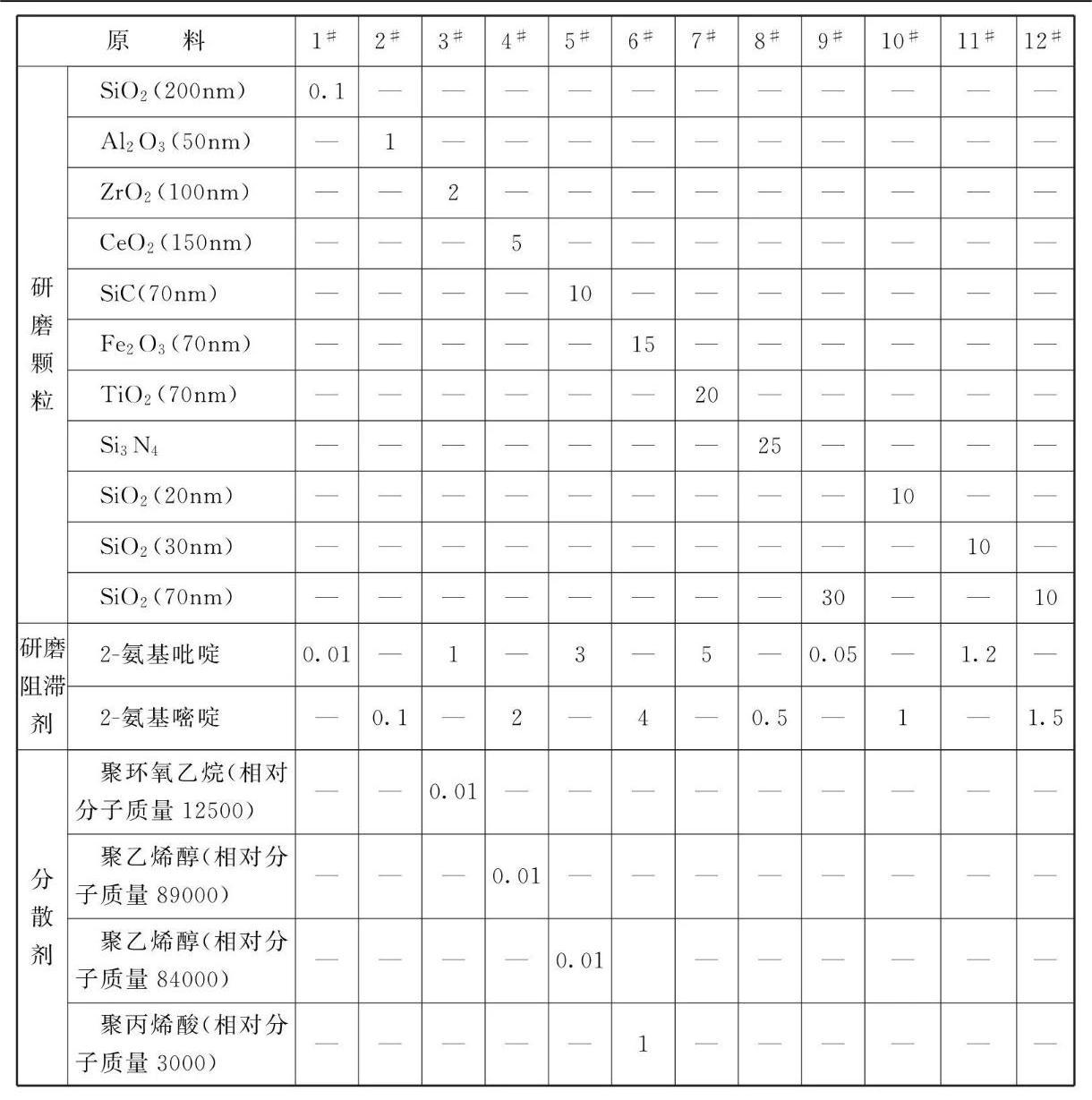 本品各组分质量份配比范围为:研磨颗粒0.1 ~30、研磨阻滞剂0.01 ~5、分散剂0.0001 ~ 1、水加至100。