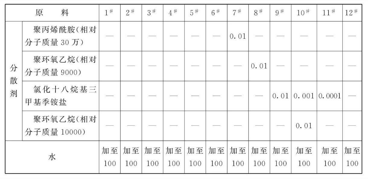 所述分散剂可选自聚合电解质,较佳地为聚乙烯醇、聚丙烯酸、聚丙烯酰胺和聚环氧乙烷中的一种或多种。其中,聚乙烯醇的相对分子质量较佳地为84000~89000,聚丙烯酸的相对分子质量较佳地为3000~5000,聚丙烯酰胺的相对分子质量较佳地约为30万,聚环氧乙烷的相对分子质量较佳地为9000 ~ 12500。