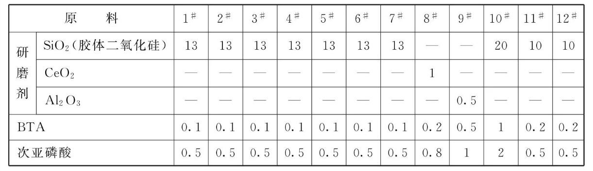 本品各组分质量份配比范围为:研磨剂1~20、次亚磷酸0.5~ 2、金属缓蚀剂0.1 ~1、氧化剂0.1~2、水加至100。