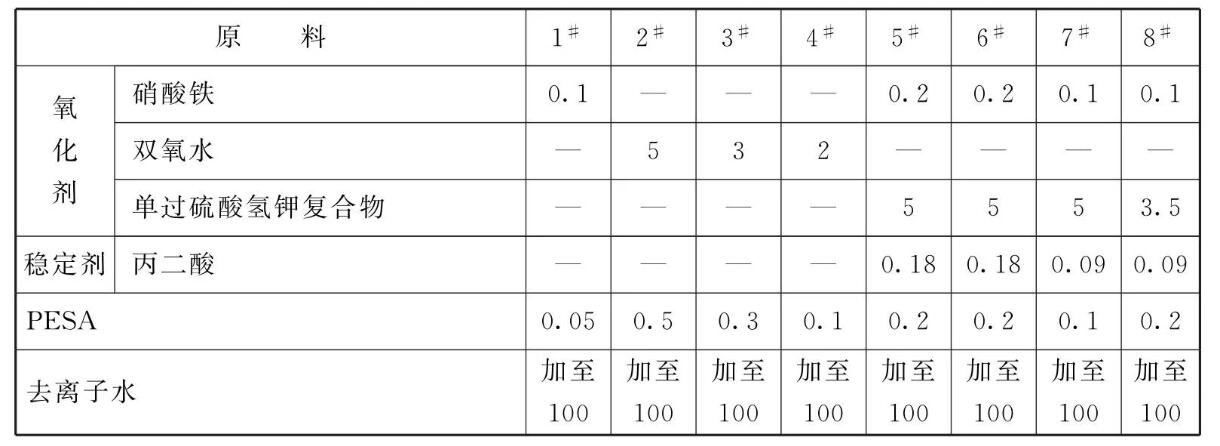 本品各组分质量份配比范围为:研磨剂0.2~5、氧化剂0.1~5、稳定剂0~0.18、 聚环氧琥珀酸(PESA) 和/或聚环氧琥珀酸的盐0.05~0.5、去离子水加至100。