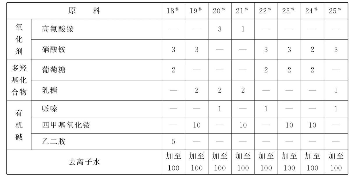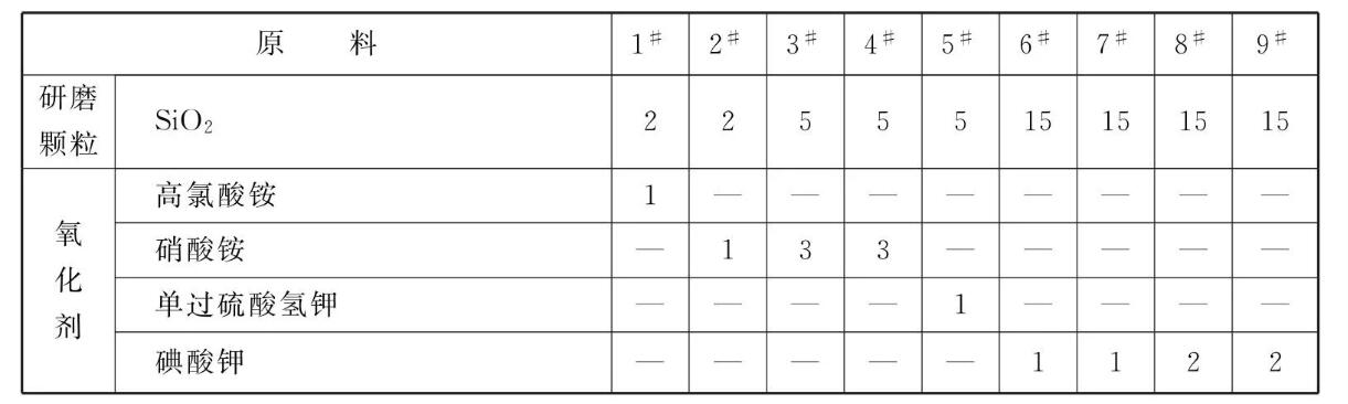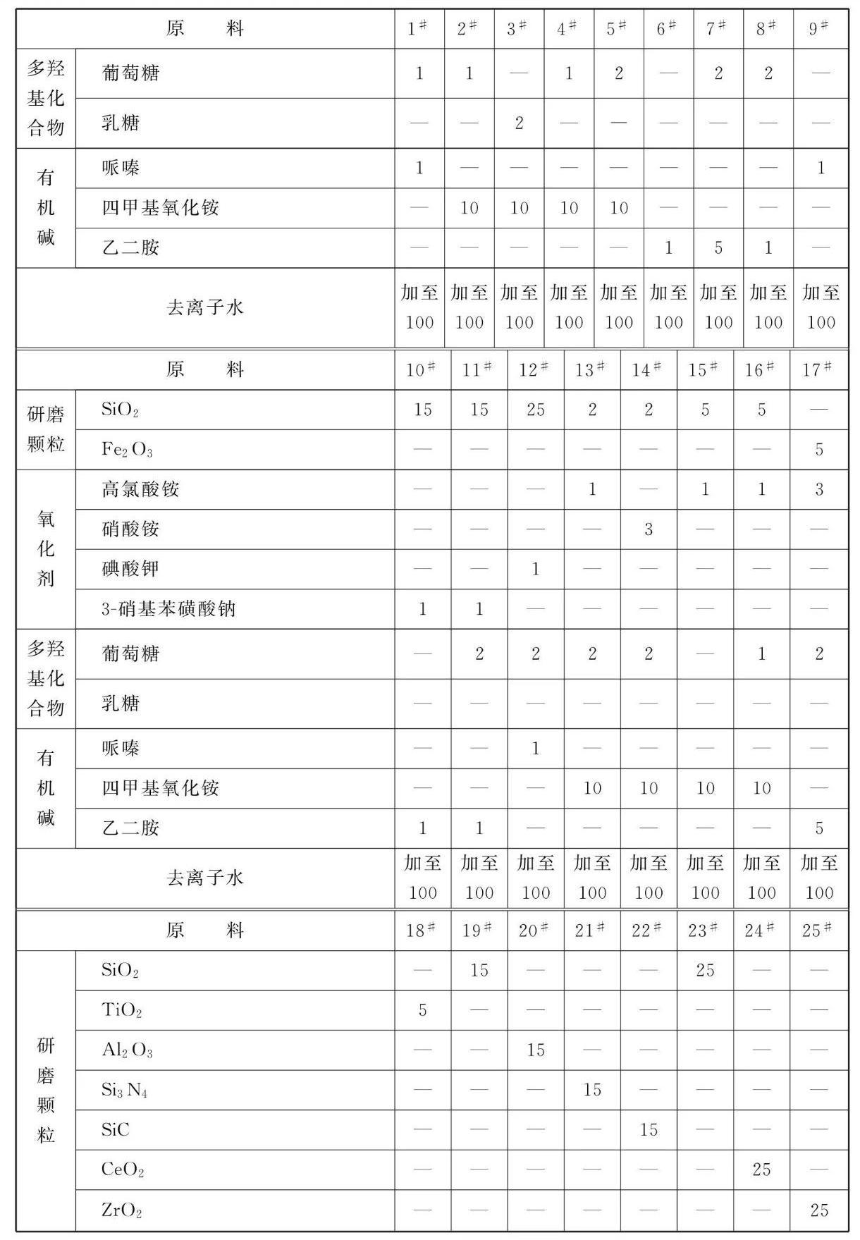 本品各组分质量份配比范围为:研磨颗粒2~ 25、氧化剂1~3、多羟基化合物1~2、有机碱1~ 10、去离子水加至100。