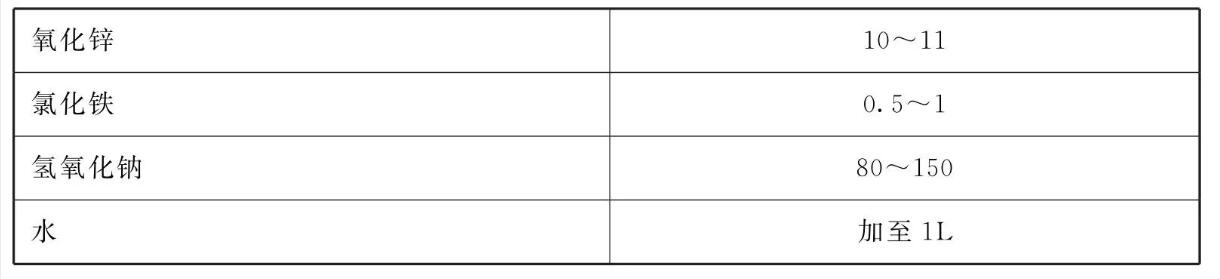 浸锌液包括:氧化锌10~11、氯化铁0.5~1、氢氧化钠80~150、水加至1L。