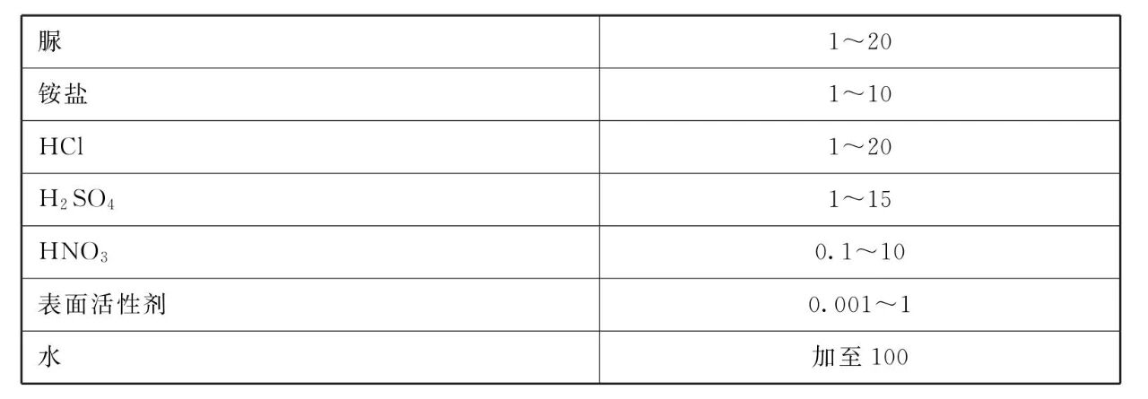 [原料配伍]本品各组分质量份配比范围为 :脲1~20、铵盐1~10、HCI 1~ 20、H2SO4 1~ 15、HNO3 0.1 ~10、 表面活性剂0.001~ 1、 水加至100。