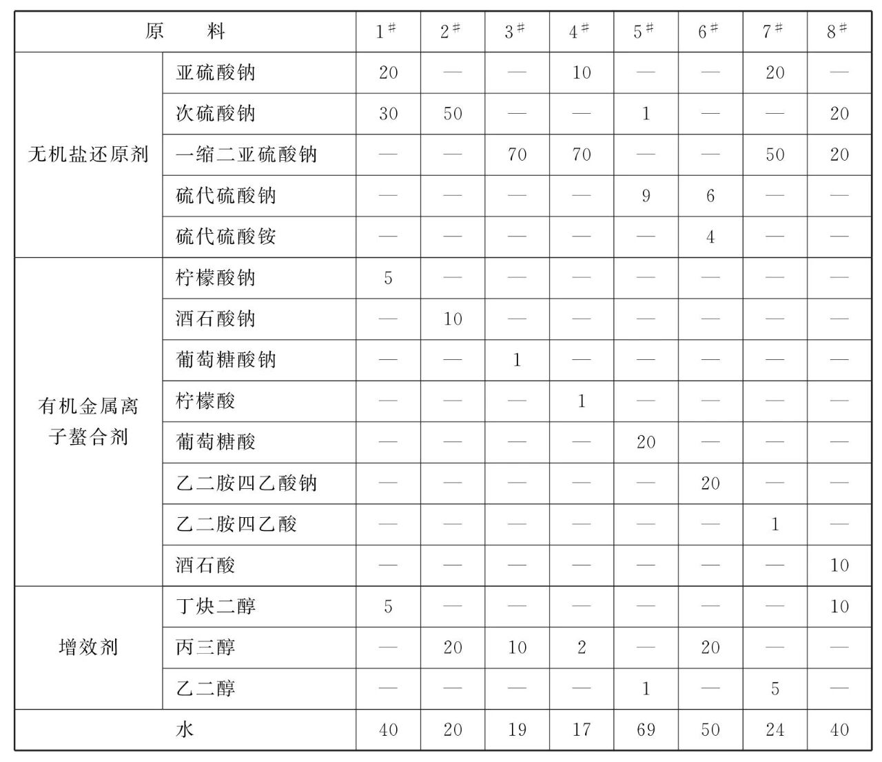 [原料配伍]本品各组分质量份配比范围为:有机盐还原剂10~70、有机金属离子螯合剂1~ 20、增效剂1 ~ 20、水10~ 70。