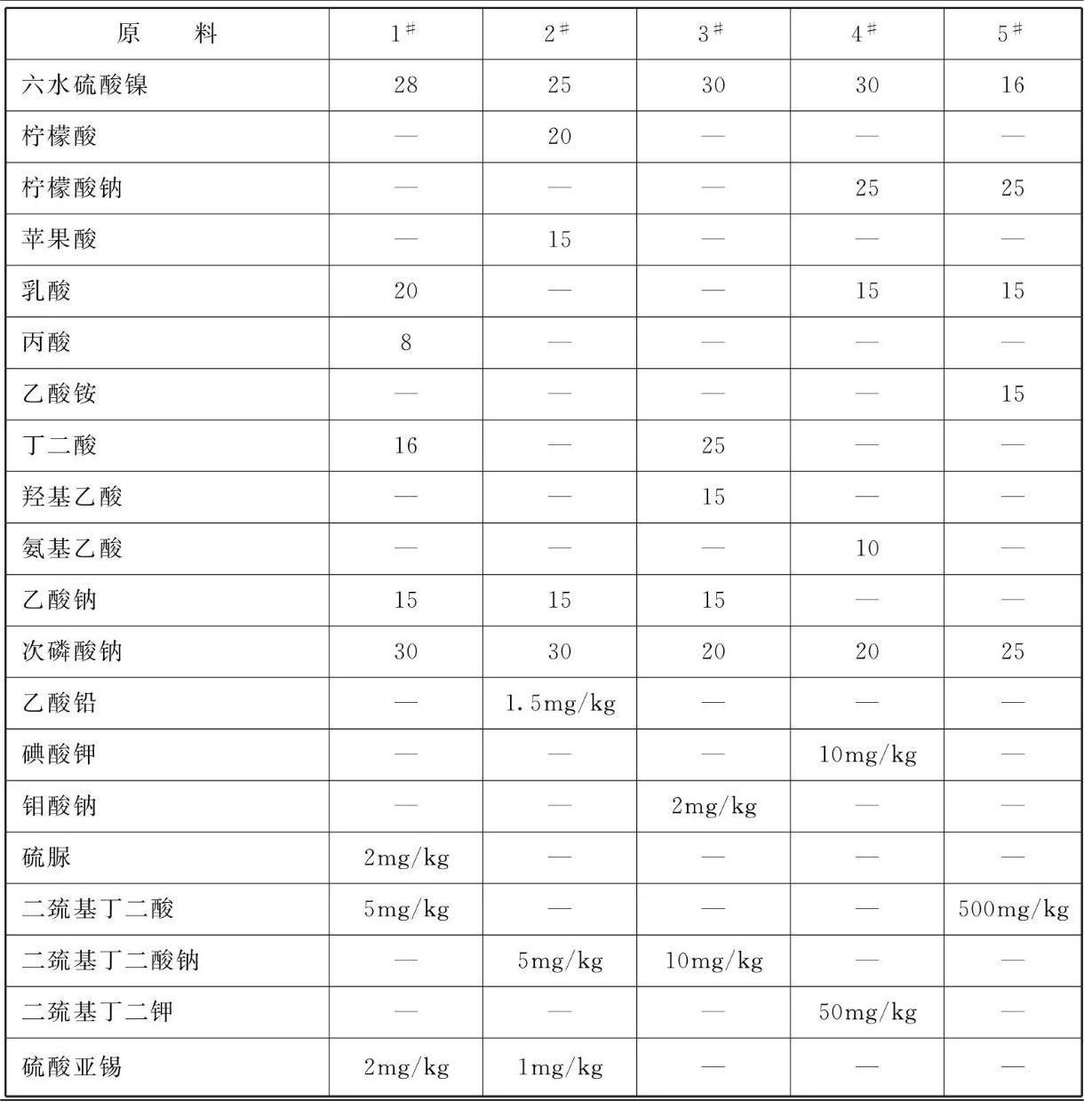 本品各组分配比范围为(g/L) :硫酸镍10~50、次磷酸钠8~ 50、含羧酸根的络合剂10~100、二价锡离子0.1 ~ 1000mg/kg、二巯基丁二酸或二巯基丁二酸盐0.2~ 1000mg/kg、水加至1L。