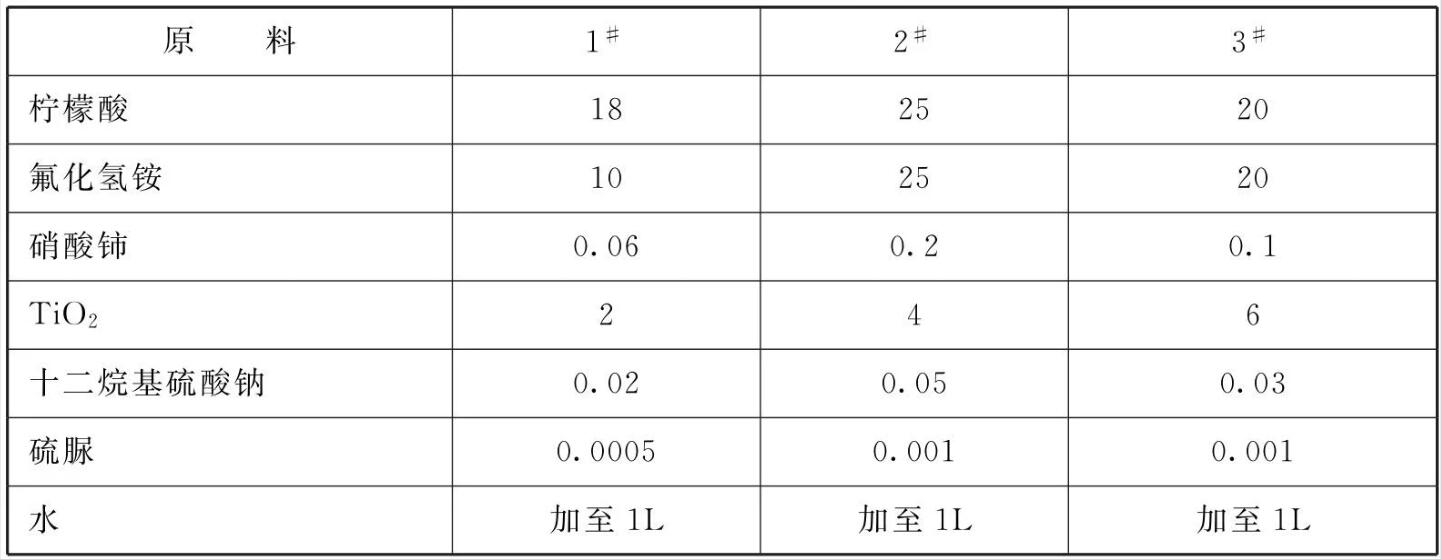 本品各组分配比范围为(g/L) :硫酸镍15~30、次亚磷酸钠14~25、柠檬酸18~25、氟化氢铵10~ 25、硝酸铈0.06 ~ 0.2、TiO2~6、十二烷基硫酸钠0.02 ~0.05、硫脲0.0005 ~ 0.01、水加至1L。