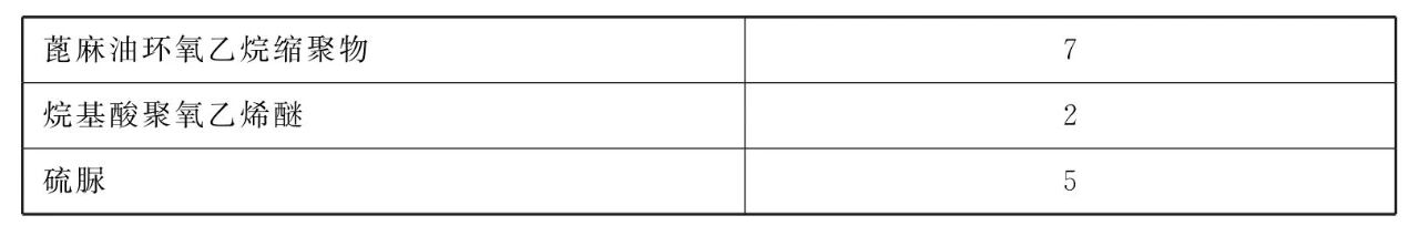 [原料配伍]本品各组分质量份配比范围为 :蓖麻油环氧乙烷缩聚物6~8、烷基酸聚氧乙烯醚1~3、硫脲4~6。