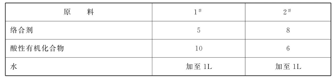 [原料配伍]本品各组分质量份配比范围为 :络合剂5~8、酸性有机化合物6~ 10、水加至1L。