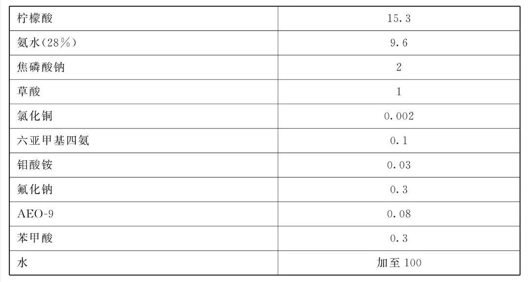 [制备方法]先用少量水溶解柠檬酸边搅拌边缓慢加入氨水(28%)反应完成后pH值为4,然后加入焦磷酸钠溶解后加入草酸,待溶解后依次加氯化铜,六亚甲基四氨,钼酸铵、氟化钠、AEO-9,苯甲酸,后加水,在每次加料前应待前面的成分经搅拌全溶解后再加入其他成分,配成的溶液pH值约5至接近中性。