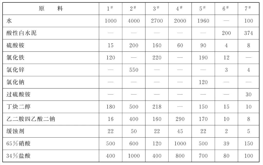 [原料配伍]本品各组分质量份配比范围为:硝酸1~50,盐酸5~50,过硫酸铵0.5~8,水溶性氯化物0~ 20,催化剂0.2 ~ 20,缓蚀剂0.1 ~5。