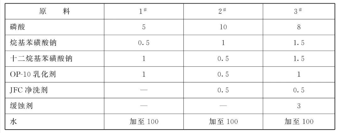 [原料配伍]本品各组分质量份配比范围为:磷酸4~12,烷基苯磺酸钠0.2 ~ 1.5,十二烷基苯磺酸钠0.2~1.5,OP-10乳化剂0.1~1,水加至100。另外还含有JFC净洗剂0.1~1份,缓蚀剂1~ 5。