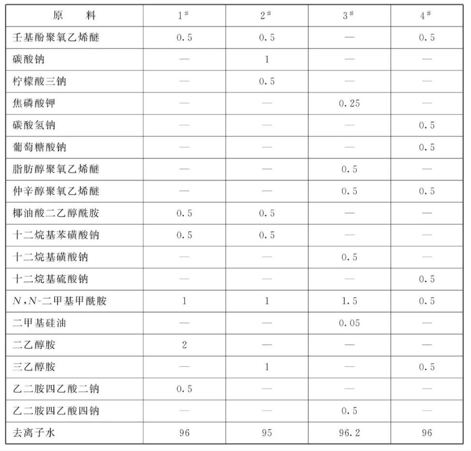[原料配伍]本品各组分质量份配比范围为:非离子表面活性剂0.5~2、阴离子表面活性剂0.25~1、络合剂0.5~ 2、除油剂1~ 10、 无机盐0.01 ~10、消泡剂0.01 ~0.05、去离子水加至100。所述非离子表面活性剂为烷基酚聚氧乙烯醚、脂肪醇聚氧乙烯醚、仲辛醇聚氧乙烯醚、椰油酸二乙醇酰胺中至少一种;