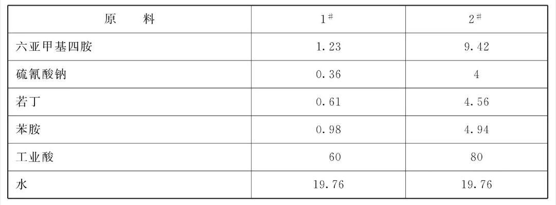 [原料配伍]本产品本品各组分质量份配比范围为:水16 ~20、六亚甲基四胺1~10、硫氰酸钠0.3~5、若丁0.5~5、苯胺0.4~5、酸60~ 80。
