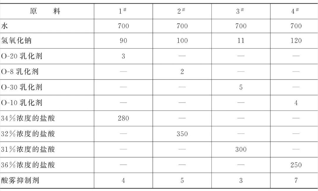 [原料配伍]本品各组分质量份配比范围为:水700、氢氧化钠90~ 120、乳化剂2~5、31% ~36%浓度的盐酸250~ 350、酸雾抑制剂3~ 7。
