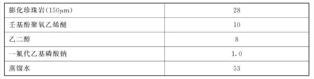 [原料配伍]本产品采用具有高吸附性的固体磨粒膨化珍珠岩10%~35%作载体材料,使其吸附0.1%~ 15%的聚氧乙烯醚类表面活性剂和C2~ C4多羟基烷基0.1%~10%、阴离子型氟代表面活性剂0.01%~2.0%,其余为水。