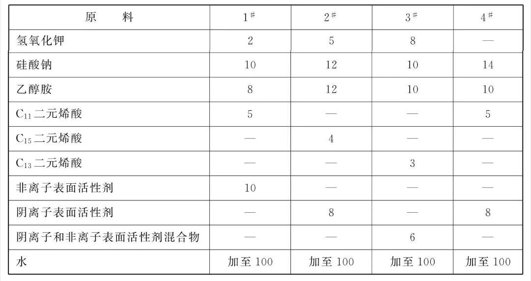 [原料配伍]本品各组分质量份配比范围为:氢氧化钾0~ 10、硅酸钠8~ 15、乙醇胺5~15、C11~C15二元烯酸1~5、表面活性剂5~10、水加至100。