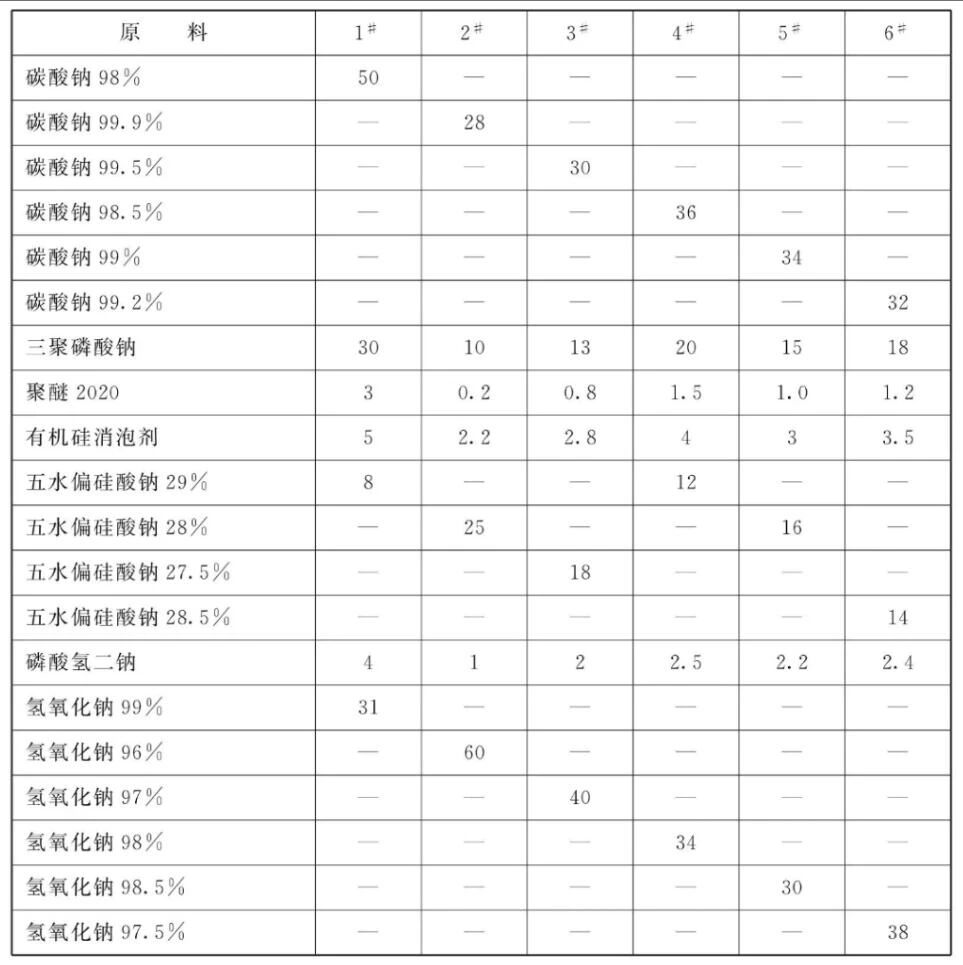 [原料配伍]本品各组分质量份配比范围为:含量98% ~99.9%的碳酸钠28~50,三聚磷酸钠10~ 30,聚醚20200.2~ 3,有机硅消泡剂2.2~5,含量27%~29%的五水偏硅酸钠8~25,磷酸氢二钠1~4,含量96%~99%的氢氧化钠30~ 60。优选配比为:含量98%~99.9%的碳酸钠30~36,三聚磷酸钠13~ 20,聚醚20200.8~ 1.5,有机硅消泡剂2.8~4,含量27% ~ 29%的五水偏硅酸钠12~18,磷酸氢二钠2~ 2.5, 含量96% ~ 99%的氢氧化钠30~ 40。