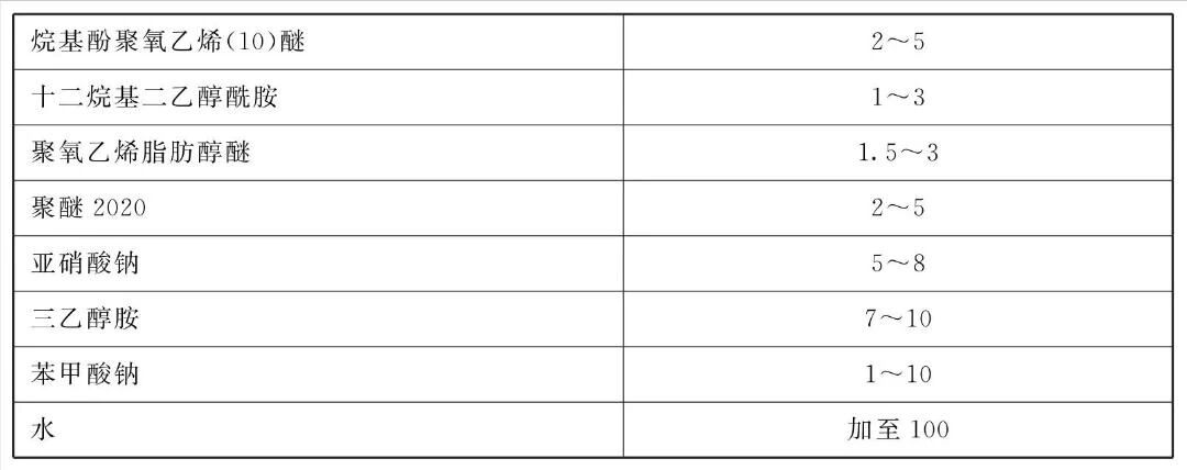 [原料配伍]本品各组分质量份配比范围为:烷基酚聚氧乙烯(10)醚1~5、十二烷基二乙醇酰胺1~5、聚氧乙烯脂肪醇醚1.5~5、聚醚20201 ~ 5、亚硝酸钠5~10、三乙醇胺5~10、苯甲酸钠1 ~10、水加至100。