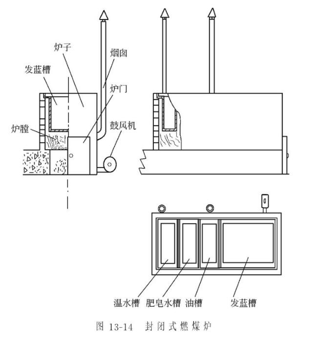 虽然如此,但总难免仍有部分工件的某些部位生成不了氧化膜;工件经几次铲动之后,已生成的氧化膜也会严重擦伤。据此情况,在笔者帮助下建了一个组成一体的封闭式燃煤炉,这种炉子的特点是:可以对发蓝工艺中四种必须加温的溶液同时加温,不但避免了野炊式加温的种种弊端,且能大大地便利加工过程,热能的利用率也大有提高。封闭式加温的装置见图13-14。