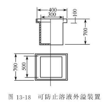 这种封闭式燃煤炉溶液升温很快,一般情况下夏季一个小时之内即能由室温达到工艺要求的温度,故炉内坐的槽子要有防溢措施,图13-17、图13-18式样的槽子具有极佳的防溢效果。溶液溢至槽沿时温度下降,溶液即回流入槽内,此时槽内溶液沸腾停止,从而起到良好的调节作用。