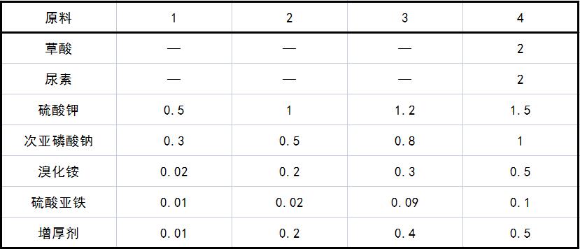 注意事项 本品各组分物质的量(mol)配比范围为:硫酸铬0.4~0.6,硫酸钾0.5~1.5,溴化铵0.02~0.5,硼酸0.5~1.2,次亚磷酸钠0.3~1,硫酸亚铁0.01~0.1,络合剂0.2~2,增厚剂0.01~0.5,水加至1L。