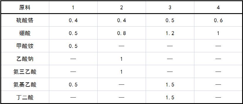 制作方法 取硫酸铬,溶于蒸馏水,搅拌至完全溶解;取硼酸溶于60~70℃的蒸馏水中,搅拌至溶解;将上述所得硫酸铬溶液与硼酸溶液混合,搅拌;加入络合剂在60℃搅拌0.5h,随后依次加入硫酸钾、次亚磷酸钠、溴化铵、硫酸亚铁、增厚剂、边加边搅拌,直至完全溶解,静止12h;添加水至接近1L;然后检测、用氨水或硫酸溶液调整镀液的pH值为1.0;定容后控温30℃。